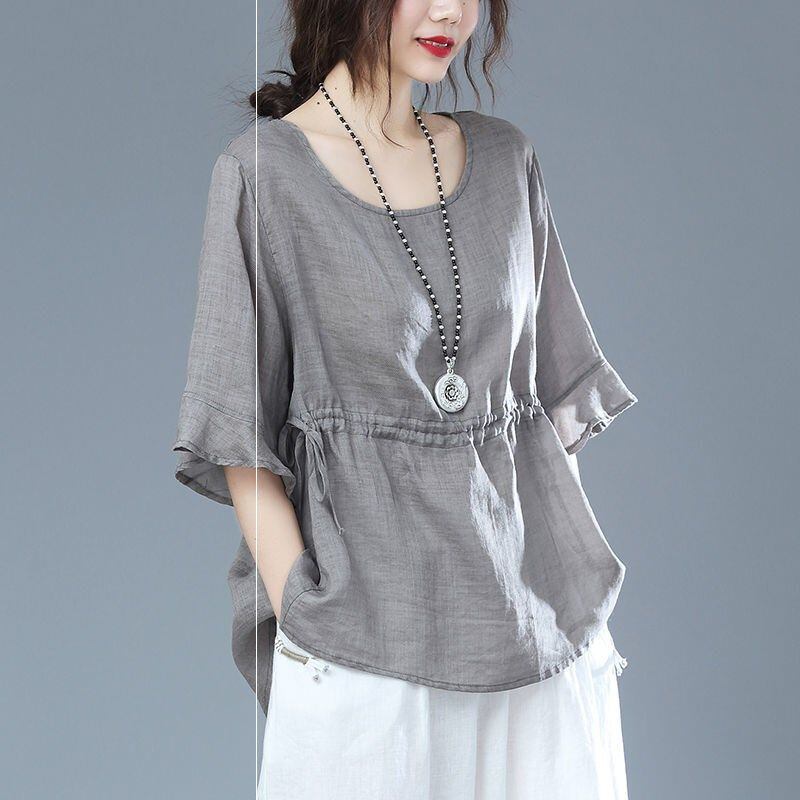 レディース ブラウス フリル ラウンドネック 半袖 トップス カジュアル 可愛い きれいめ 上品 ナチュラル おしゃれ お出かけ グレー ブルー