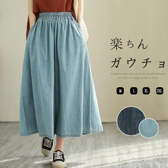 ガウチョパンツ デニム レディース ワイドパンツ 大きいサイズ パンツ ゆったり 夏 春 ガウチョ スカートみたい 九分丈 ネイビー ブルー