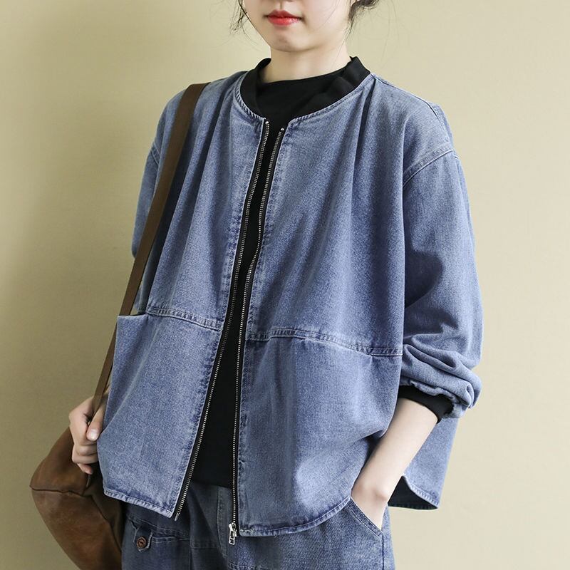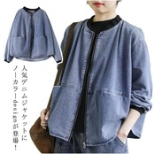 ジージャン Gジャン デニムジャケット ノーカラー 丸首 ストレッチ レディース ジーンズ アウター ノーカラー シンプル 長袖 春アウター ネイビー