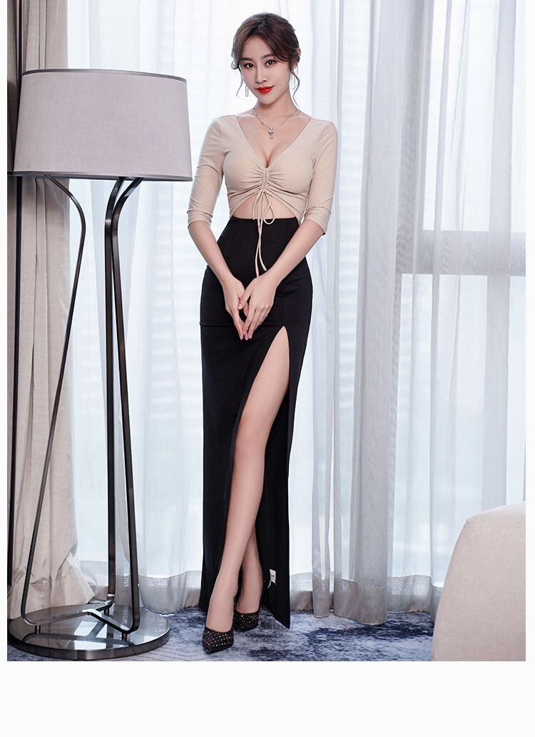 ミニ丈トップスとスリットが長く入ったロングスカートの組み合わせがセクシーなタイトワンピース、ドレスです。