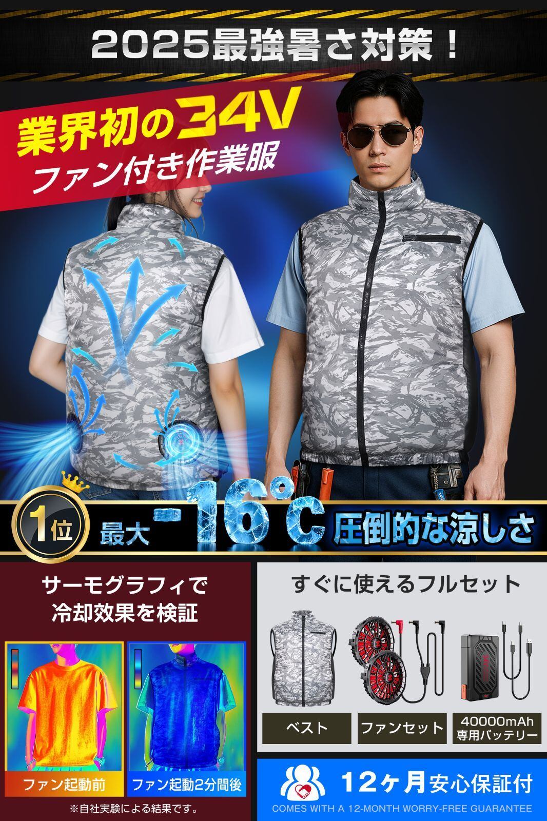 2025新設計 34V超高出力 · 体感-16℃ 空調作業服 ベスト ファン付き作業服 日本製ブラシレスDCモーター 16~34V出力 暴風 強力 風量200%UP ファン付きベスト 冷却服 UVカット 40000mAh 熱中症対策 男女
