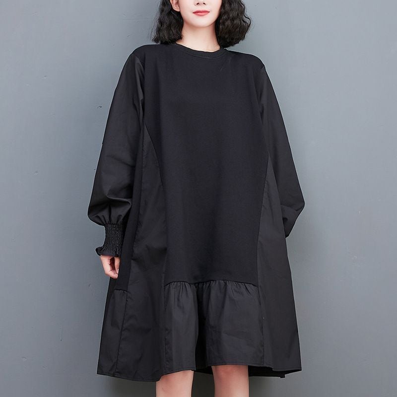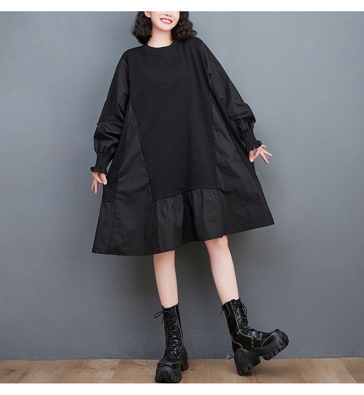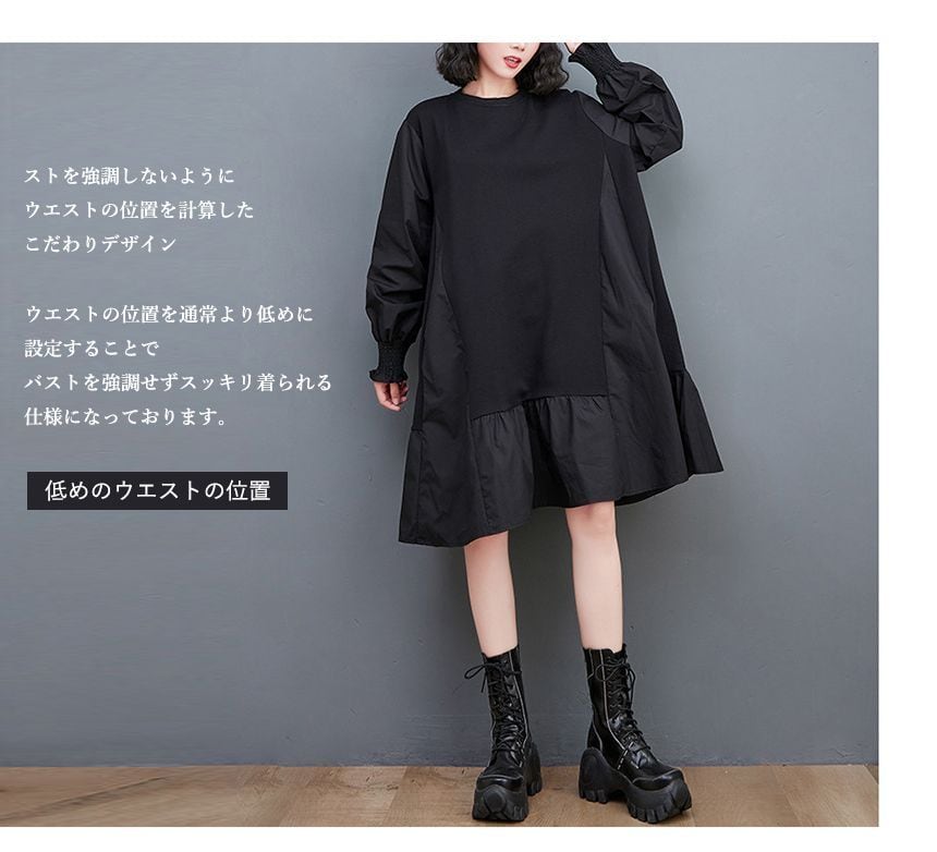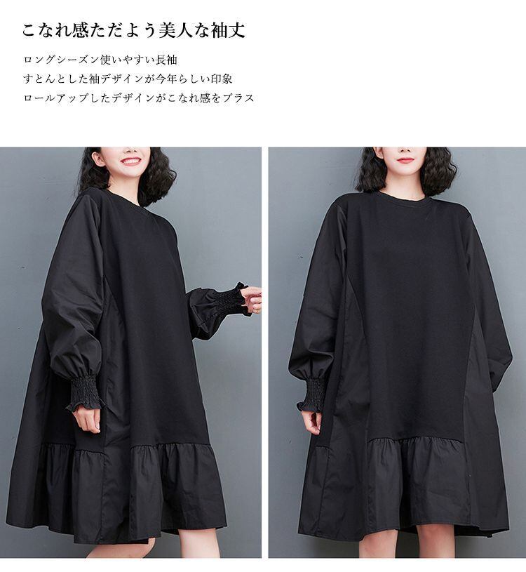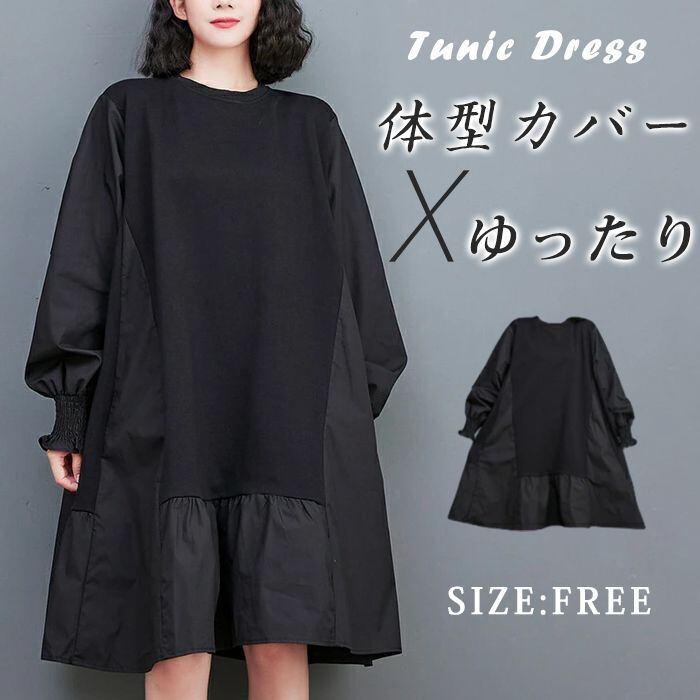 チュニックワンピ ワンピース 長袖 バルーンスリープ 春 秋 レディース きれいめ ぽわん袖 ゆったり 異素材 着やせ 体型カバー ビッグシルエット パッチワーク カジュアルziruo01
