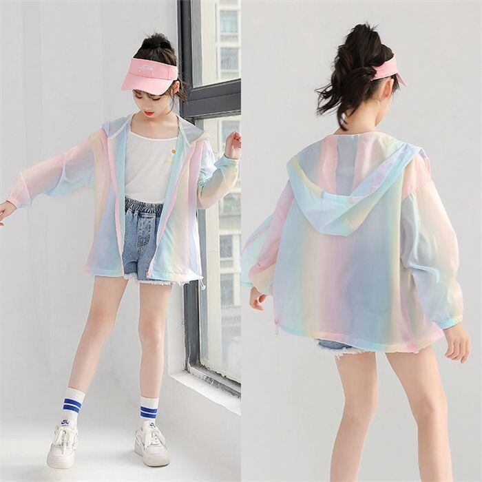 UVカット カーディガン 子供 女の子 キッズ ラッシュガード パーカー 子供用 接触冷感 日焼け止め 夏 春 秋 薄型 長袖 UV対策 虹色 UVカットアウター フード付き サマーカーディガン 羽織り youyi07