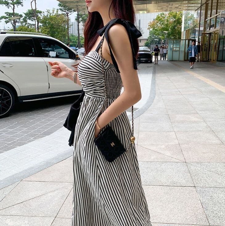 ワンピース ショルダー リボン ウエスト切り替え ストライプ キャミワンピース リボン レディース ロングワンピース 春 夏 ドレス 半袖ワンピース ストライプ きれいめ ワンピ カジュアル オシャレ 可愛い 韓国ファッション