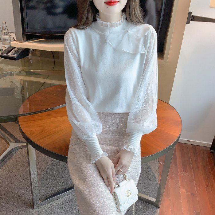 ニットトップス ブラウス レディース シフォン シアースリーブ トップス ぽわん袖 ニット 長袖 透け感 プルオーバー 無地 薄手skwxiaomi05