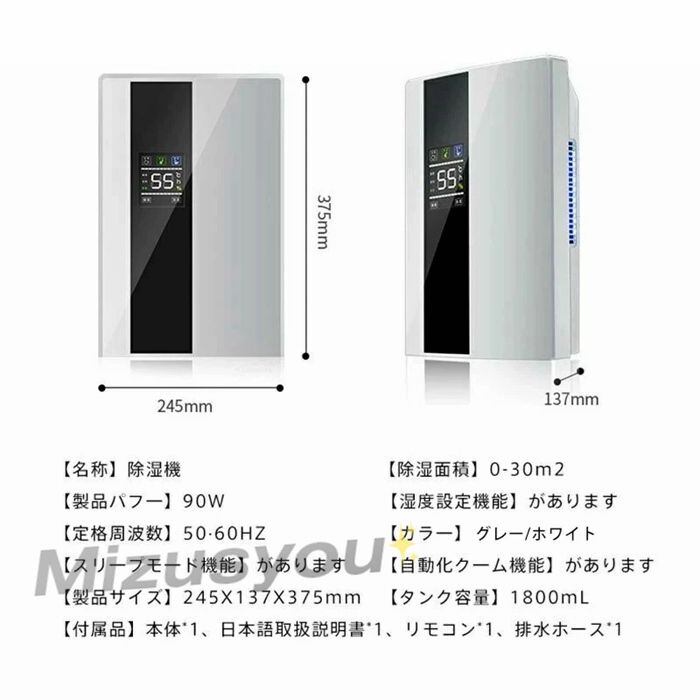 梅雨のじめじめした時期にも冬の低温時にも除湿力抜群、湿気バイバイ!除湿機は、空気中の汚れを浄化し、湿気によるカビやダニの繁殖を防ぎ、家族の健康を守るマイナスイオン洗浄機能を備えています。室温30℃、湿度RH80%を維持し続けたとき、1日(24時間)当たり2.0Lの除湿量です。