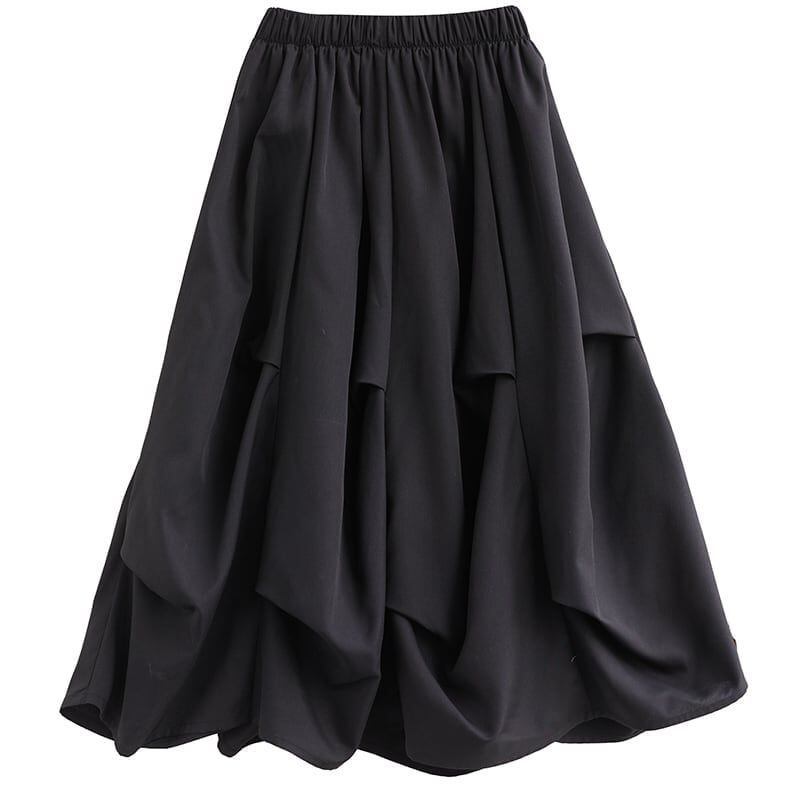 ピンチプリーツで作られたチューリップのようなシルエットが魅力的な、ブラックのミドル丈・バルーンスカートです。ウエストはゴムなので、着脱が簡単で履き心地が良いアイテムです。シックなブラックで、何にでも合わせやすいです。