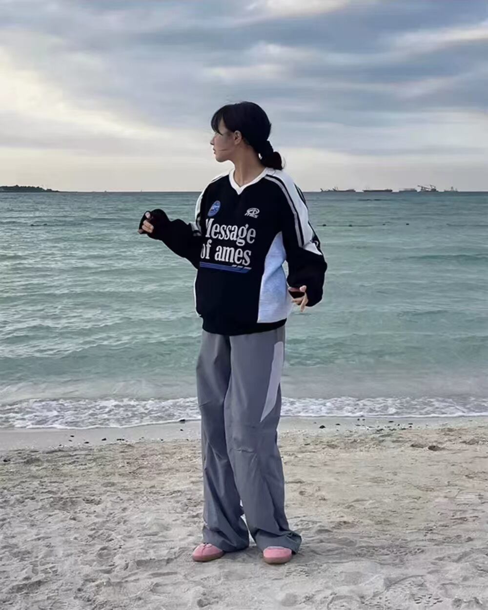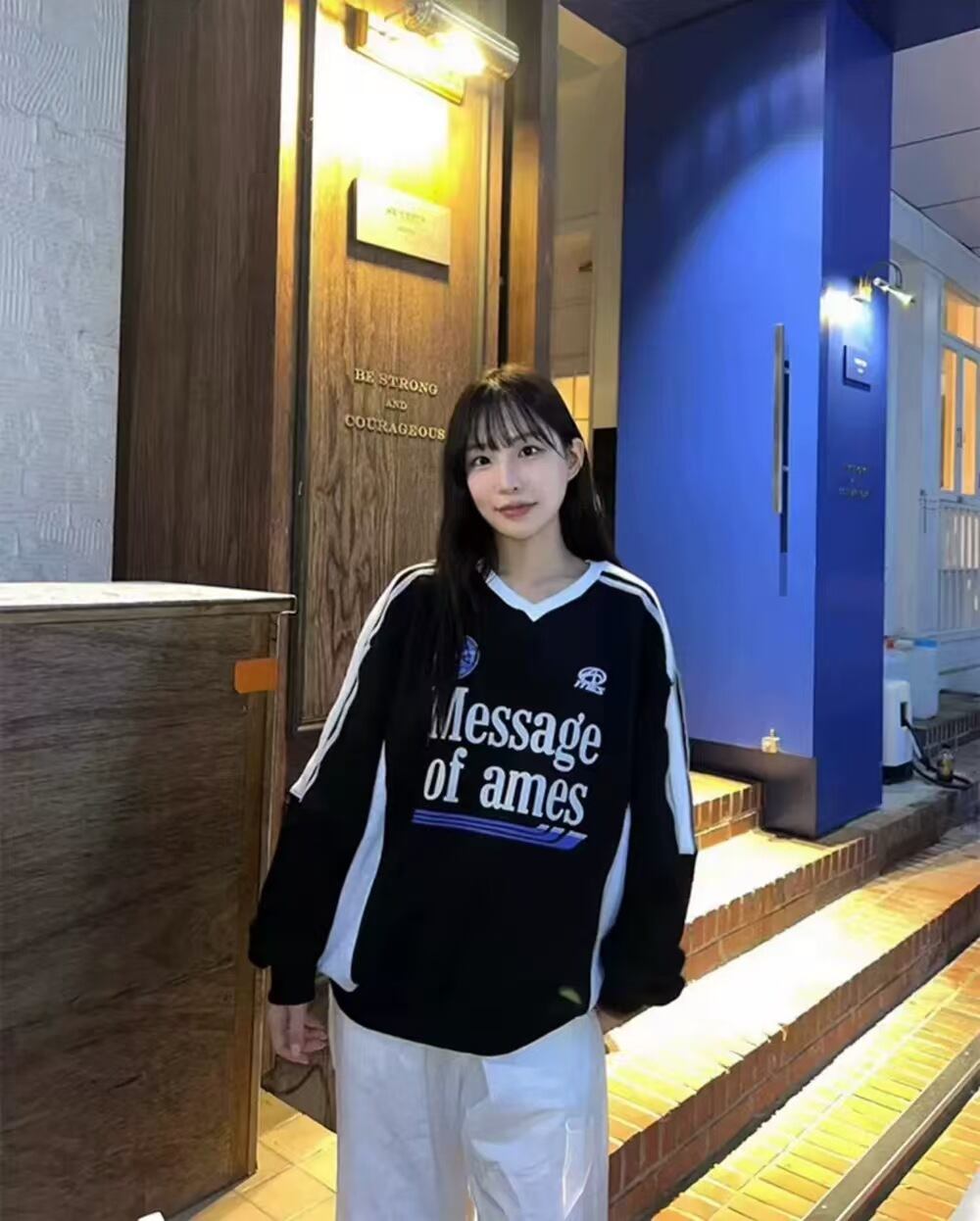 人気 韓国 ファッション SEVENTEENジョンハン着用 長袖 男女兼用 AMES-WORLDWIDE アメスワールドワイド Vネックユニフォームスウェット ブラック