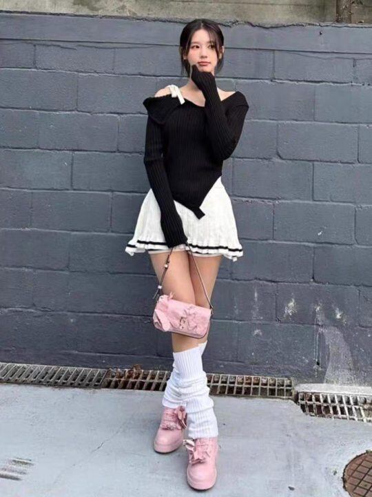 人気 韓国 GLOWNY グロウニー (G)I-DLE ミヨン 着用 アシンメトリーニット 長袖 ISA ASYMMETRICAL KNIT TOP ブラック