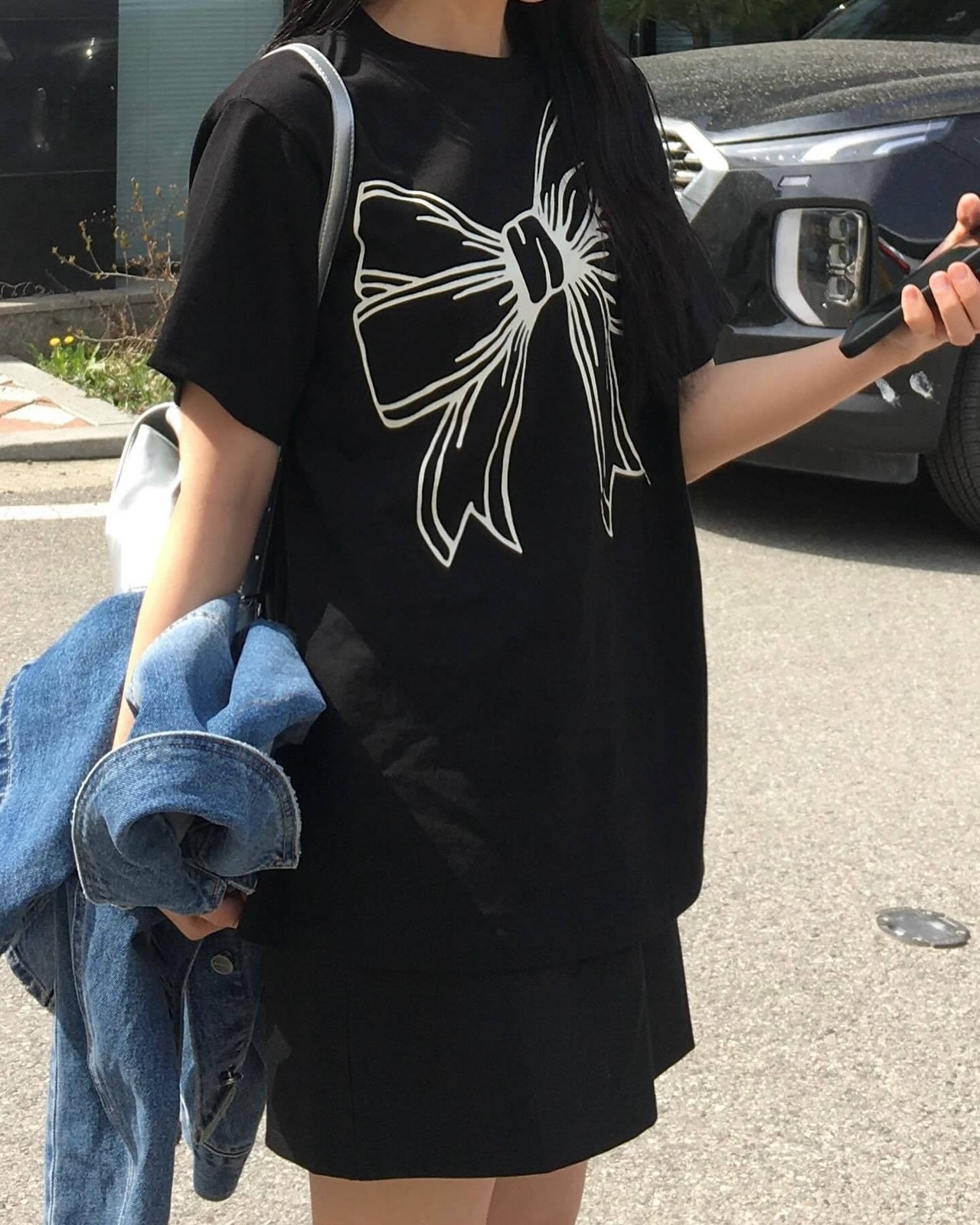 ロンロン 韓国ファッション BIG RIBBON LINE T SHIRT 人気Tシャツ 半袖 カットソー