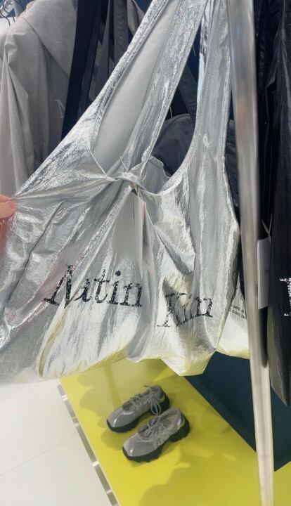 韓国 Matin Kim マーティンキム エコバッグ ショルダーバッグ レディースファッション MATIN CRACKED LOGO GLOSSY ECO BAG SILVER