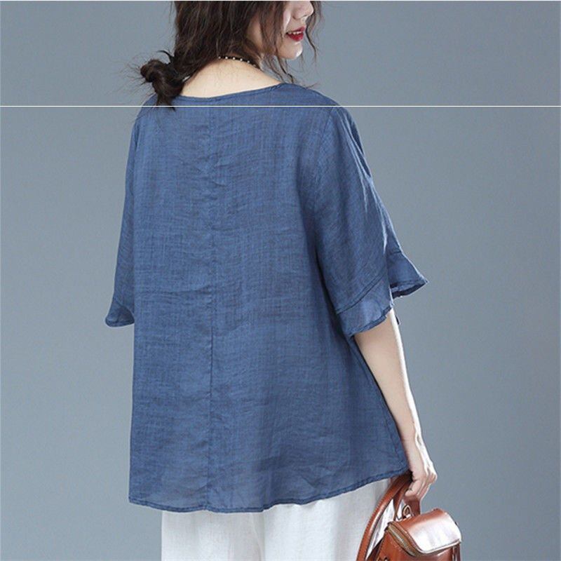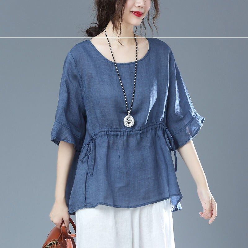 レディース ブラウス フリル ラウンドネック 半袖 トップス カジュアル 可愛い きれいめ 上品 ナチュラル おしゃれ お出かけ グレー ブルー