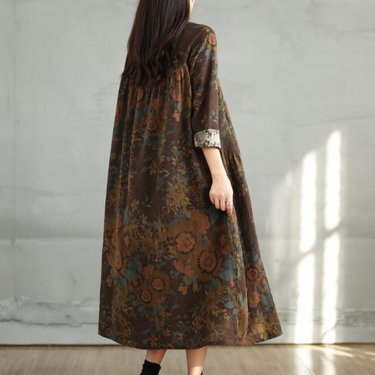 落ち着いたブラウン系の花柄が印象的なロングワンピースです。全体的にゆったりとしたシルエットで、体型を気にせずリラックスして着られます。ウエストにややギャザーが入っており、自然な立体感でスタイルアップ効果も◎。袖口には裏地の切り替えがあり、折り返して見せてもおしゃれなポイントになります。ポケット付きで、実用性も兼ね備えた一枚。レトロな雰囲気を楽しみながら、ナチュラルな大人スタイルが完成します。
