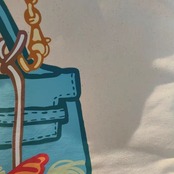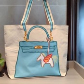 アイボリーのベースに、鮮やかなブルーのバッグと可愛い馬のイラストが施されており、視覚的なインパクトがあります。