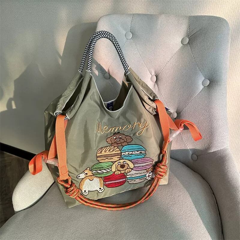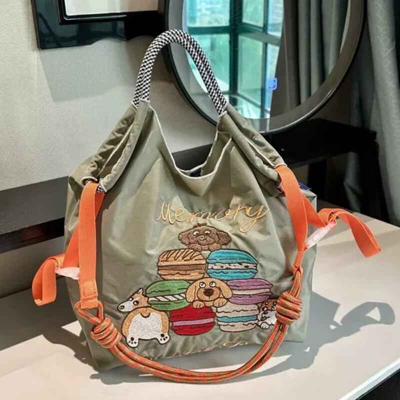 人気商品 Ball Chain ボールアンドチェーン エコバッグ トートバッグ ショッピングバッグ ショルダーストラップ付き 大容量 マカロンの刺繍 Lサイズ カーキ色