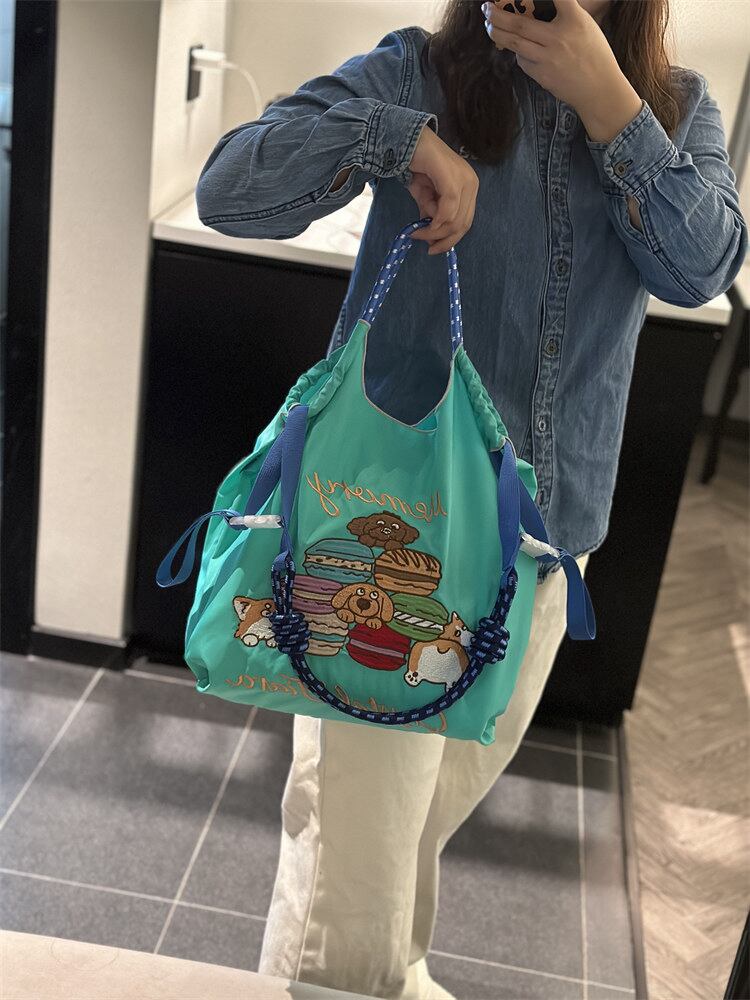 即購入大歓迎 Ball Chain ボールアンドチェーン エコバッグ トートバッグ ショッピングバッグ ショルダーストラップ付き 大容量 マカロンの刺繍 Mサイズ グリーン