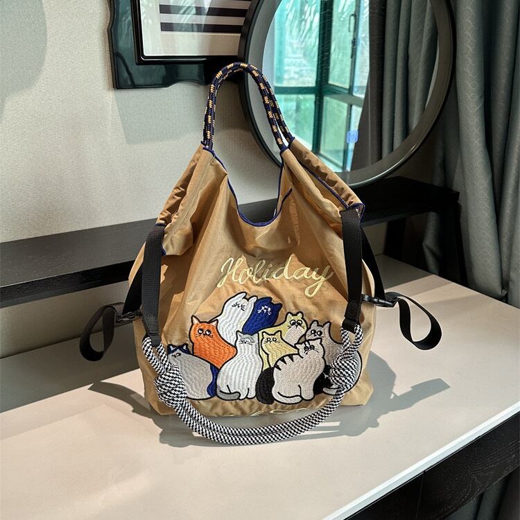 新品未使用 Ball Chain ボールアンドチェーン エコバッグ トートバッグ ショッピングバッグ ショルダーストラップ付き 大容量 猫の刺繍 Mサイズ カーキ色