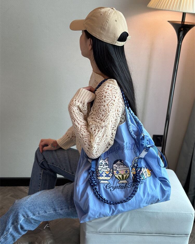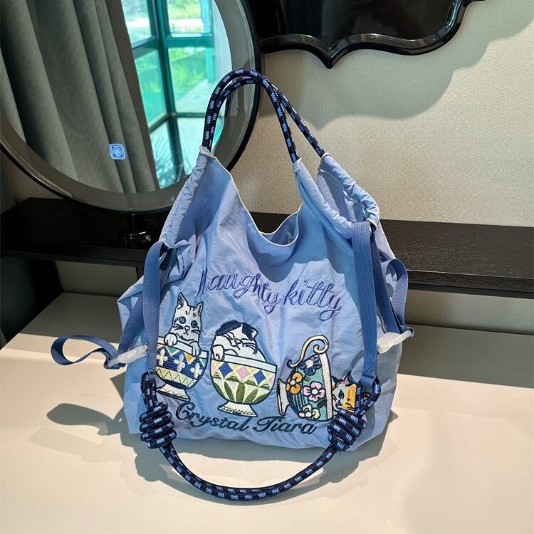 人気商品 Ball Chain ボールアンドチェーン エコバッグ トートバッグ ショッピングバッグ ショルダーストラップ付き 大容量 猫の刺繍 Mサイズ ブルー