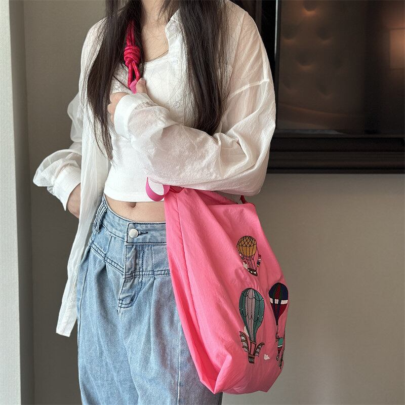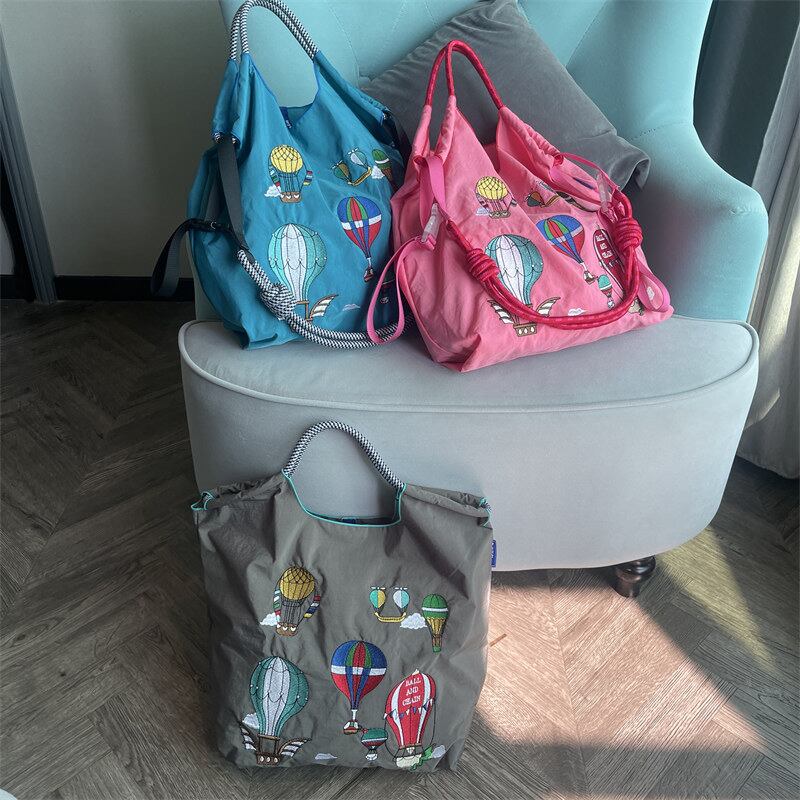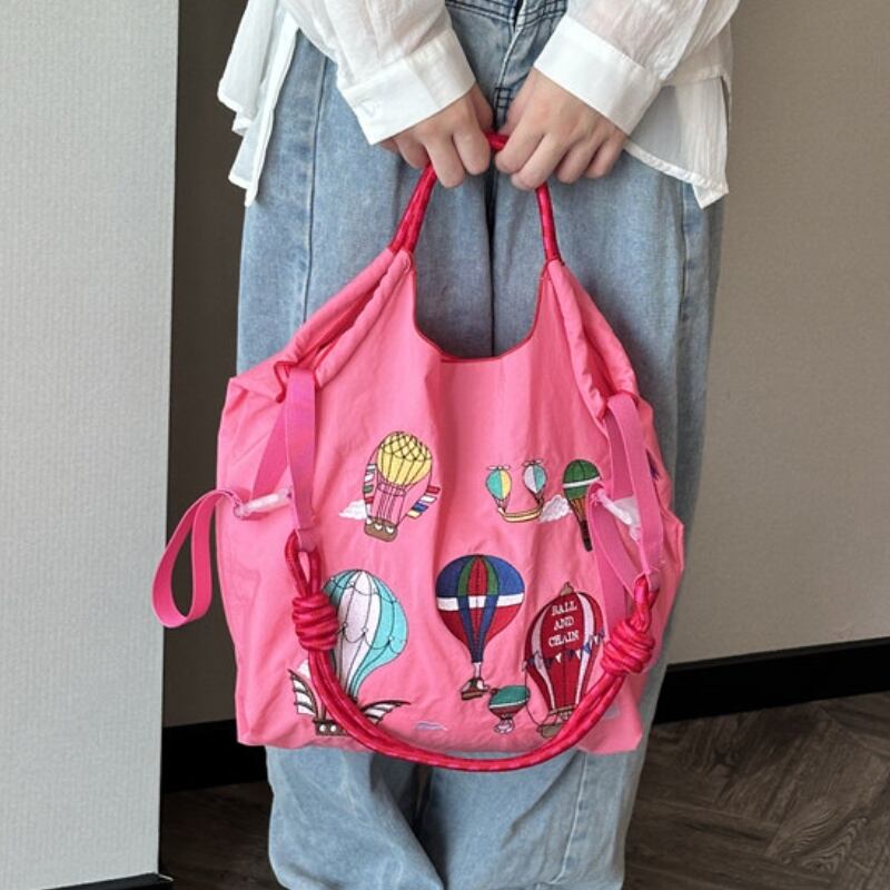 大人気 Ball Chain ボールアンドチェーン エコバッグ トートバッグ ショッピングバッグ ショルダーストラップ付き 大容量 熱気球の刺繍 Lサイズ ピンク