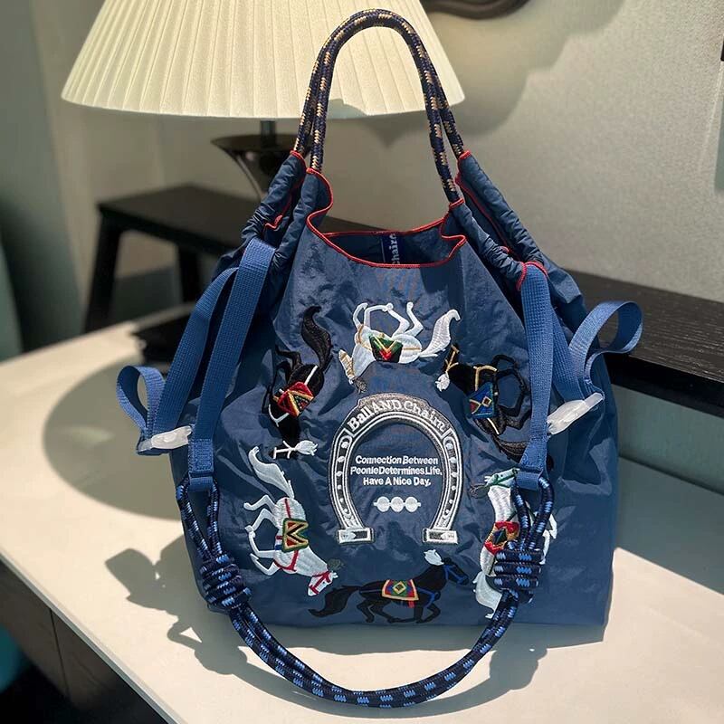 即購入大歓迎 Ball Chain ボールアンドチェーン エコバッグ トートバッグ ショッピングバッグ ショルダーストラップ付き 大容量 馬の刺繍 Mサイズ ブルー