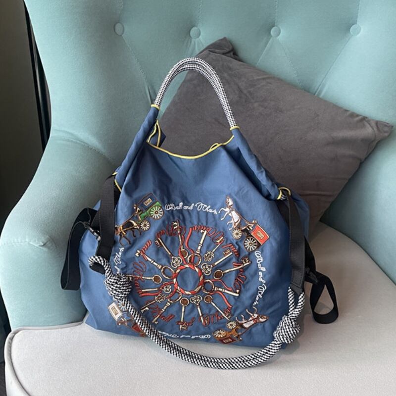 人気商品 Ball Chain ボールアンドチェーン エコバッグ トートバッグ ショッピングバッグ ショルダーストラップ付き 大容量 馬車の刺繍 Lサイズ ブルー