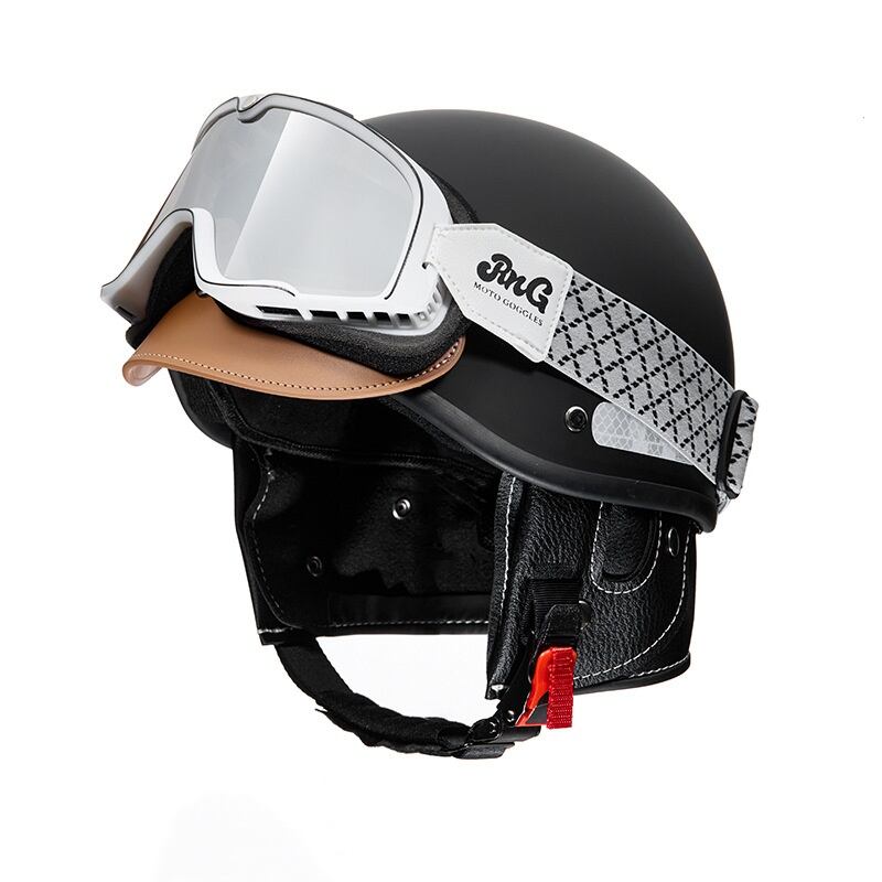 レトロオープンフェイスオートバイヘルメット ECE/DOT 承認 バイクパイロットヘルメット男性女性 ショートレザーバイザー付きストリートオートバイハーフヘルメット クルーザー原付チョッパー用ヘルメット シルバーゴーグル付きオープンフェイスヘルメット
