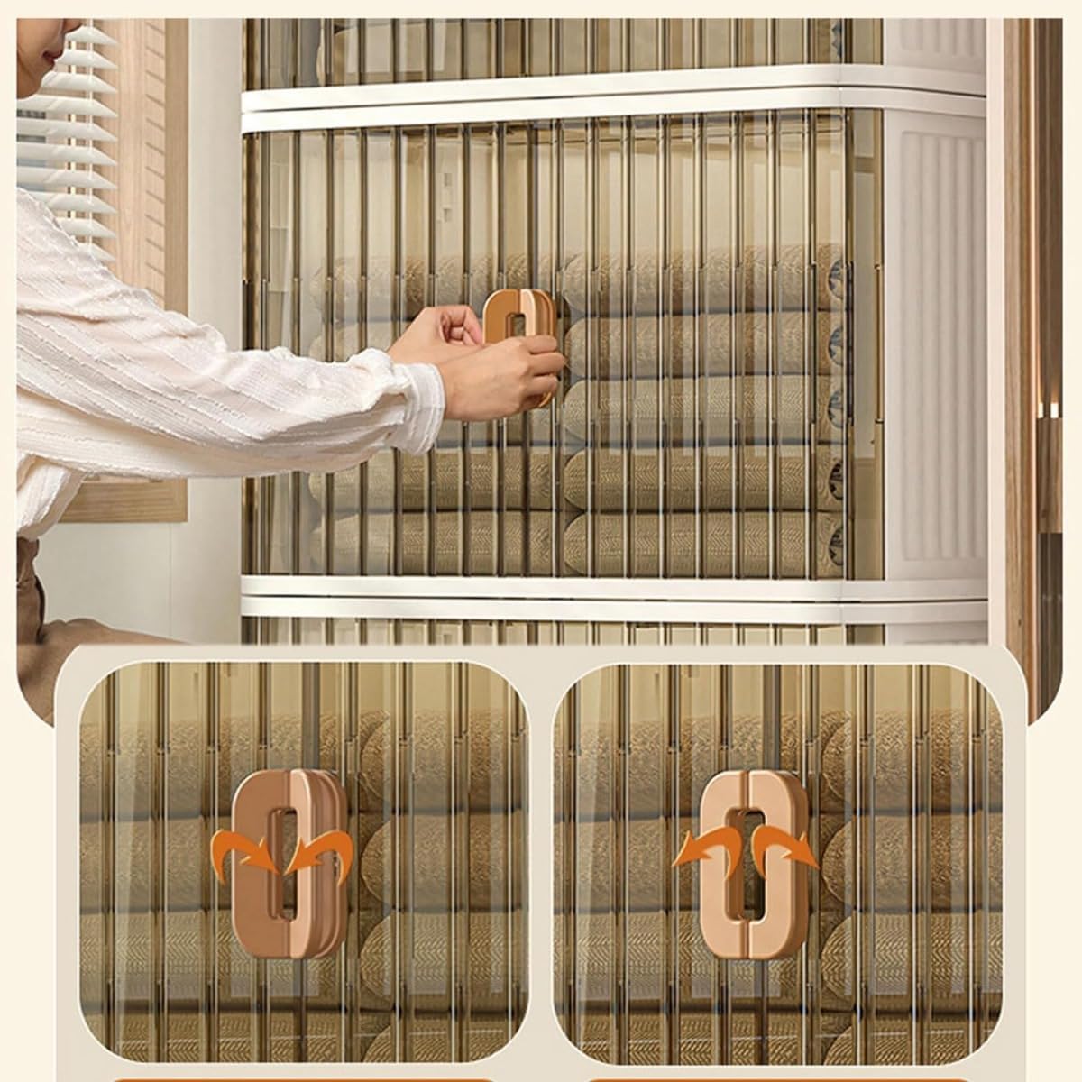 【2つの開き方】折りたたみ式収納箱は2つの開き方が可能です。上部の蓋を開ける方法と、前面扉から開ける方法があります。前面扉にはロックバックルが内蔵されており、ブラウンの取っ手を回転させて扉のロックとロックをコントロールし、扉が勝手に開いてしまうことがないようにします。前面扉は、引き出しや上蓋を取り外すことなく、中の物を簡単に取り出せます。埃を寄せ付けません。