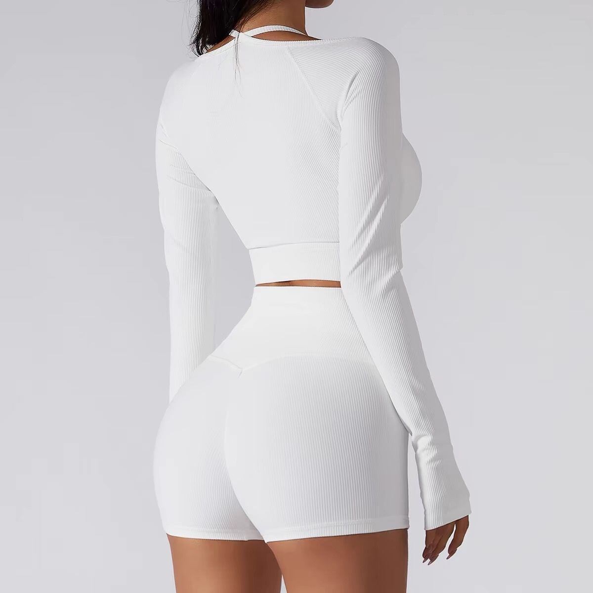 この上下セットには、ショートパンツとへそ出しのタイトなデザインの長袖Tシャツが含まれています。