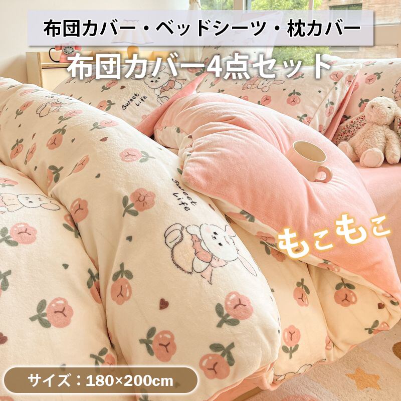 もこもこ 布団カバー 4点セット バラ 模様フランネル 洗える 掛け カバー 吸湿 発熱 暖かい 冬用 防寒 ベッドシーツ 枕カバー 寝具セット 秋冬 北欧 ホワイト×ピンク